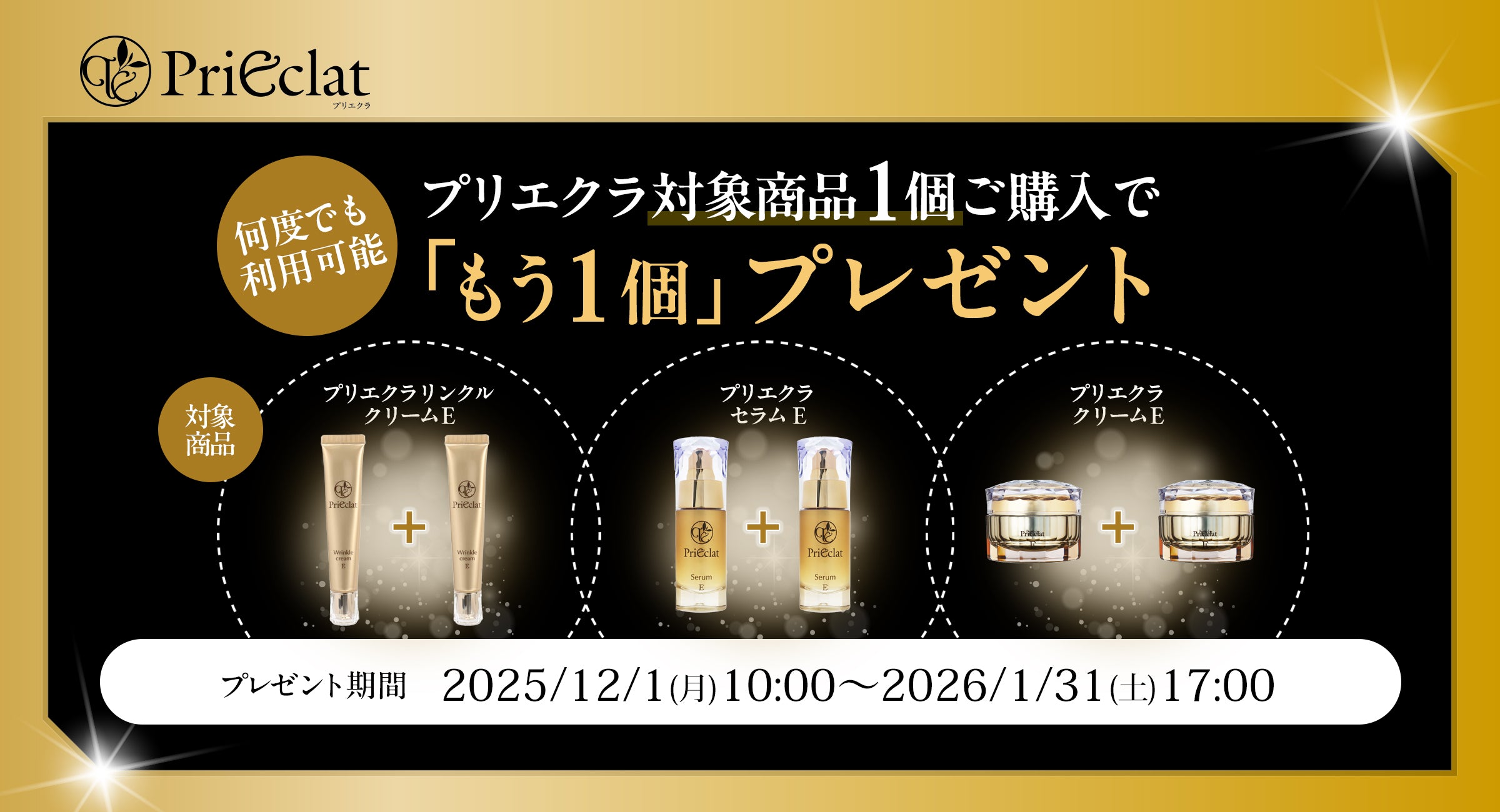 期間中は何度でもご利用OK!プリエクラの対象商品を1個ご購入で同一商品をもう1個プレゼント!乾燥が気になる季節にぴったりの人気3アイテムを"実質半額"でお試しいただける大チャンスです。